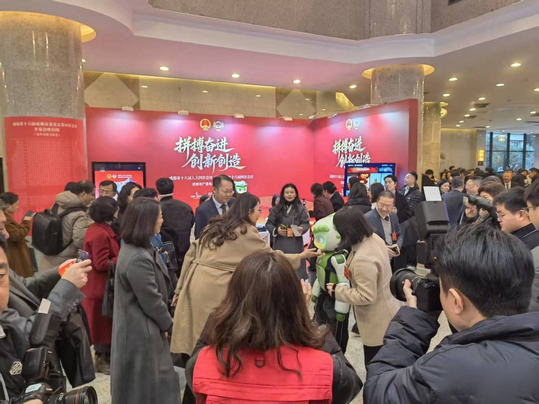 1月27日,成都两会现场,一只热情好客、善于交流的“小话痨”——“爱湫”机器人,自如地与参会嘉宾互动。