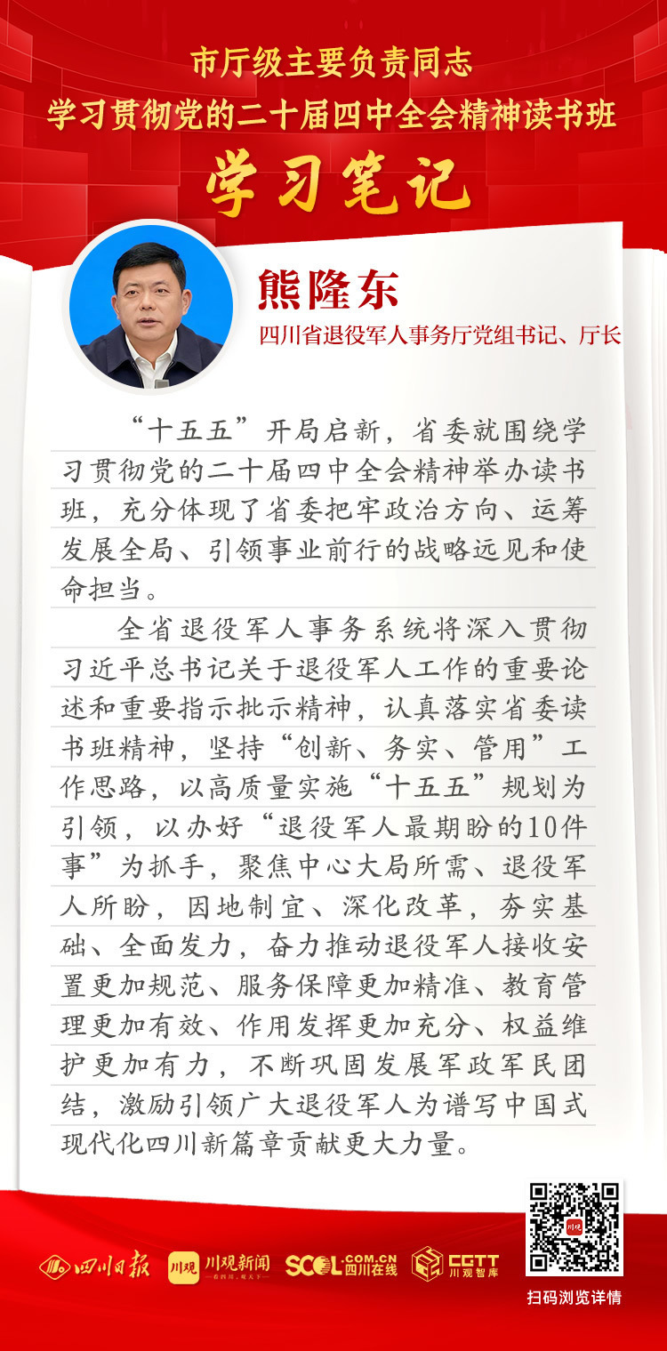 全省退役军人事务系统将深入贯彻习近平总书记关于退役军人工作的重要论述和重要指示批示精神,认真落实省委读书班精神,坚持“创新、务实、管用”工作思路,以高质量实施“十五五”规划为引领,以办好“退役军人最期盼的10件事”为抓手,聚焦中心大局所需、退役军人所盼,因地制宜、深化改革,夯实基础、全面发力,奋力推动退役军人接收安置更加规范、服务保障更加精准、教育管理更加有效、作用发挥更加充分、权益维护更加有力,不断巩固发展军政军民团结,激励引领广大退役军人为谱写中国式现代化四川新篇章贡献更大力量。