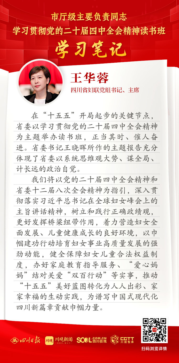 我们将以党的二十届四中全会精神和省委十二届八次全会精神为指引,深入贯彻落实习近平总书记在全球妇女峰会上的主旨讲话精神,树立和践行正确政绩观,更好发挥桥梁纽带作用,着力营造妇女全面发展、儿童健康成长的良好环境,以巾帼建功行动培育妇女事业高质量发展的强劲动能,健全保障妇女儿童合法权益制度,办好家庭教育指导服务、“爱心妈妈”结对关爱“双百行动”等实事,推动“十五五”美好蓝图转化为人人出彩、家家幸福的生动实践,为谱写中国式现代化四川新篇章贡献巾帼力量。