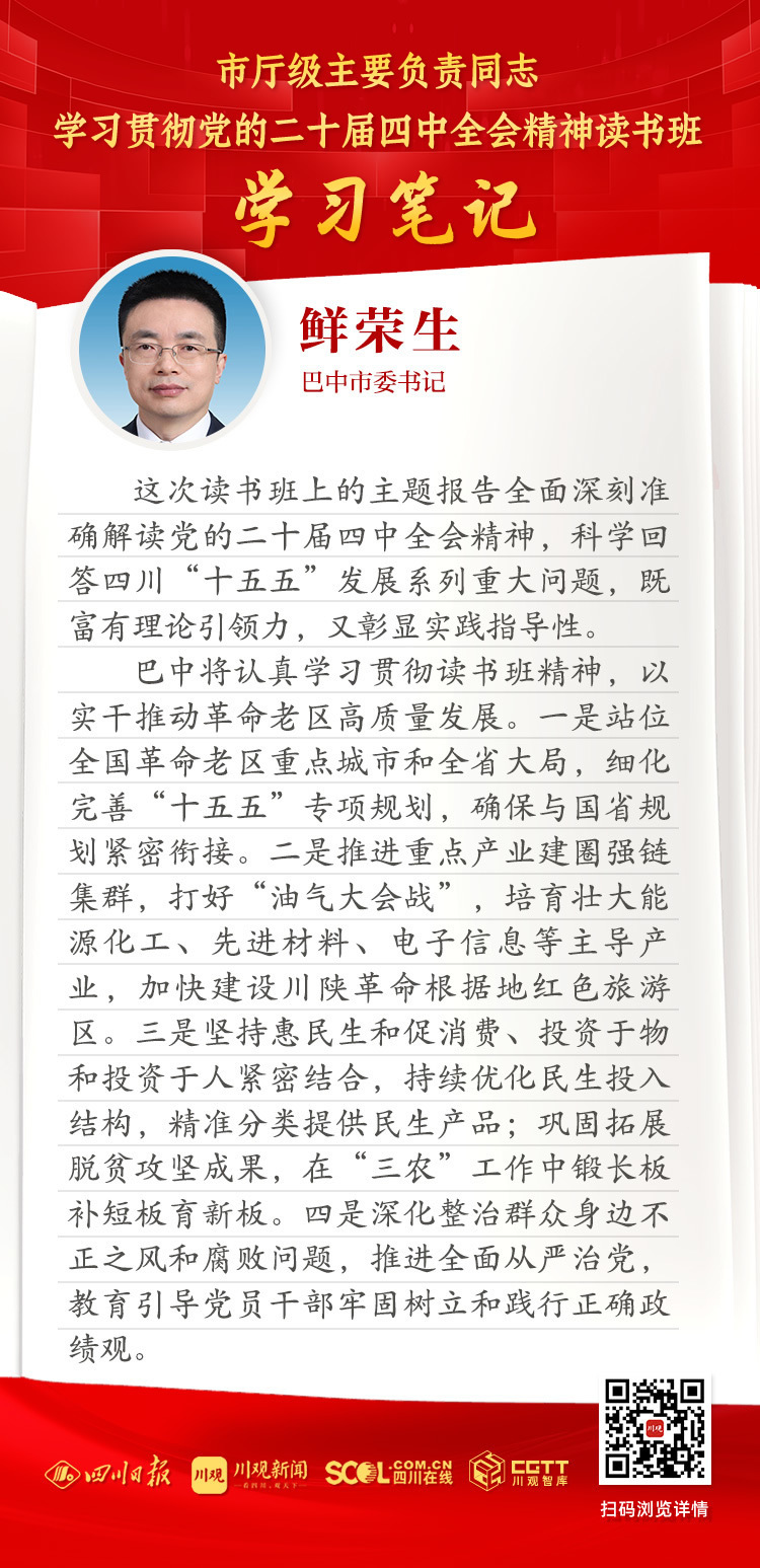 巴中将认真学习贯彻读书班精神,以实干推动革命老区高质量发展。一是站位全国革命老区重点城市和全省大局,细化完善“十五五”专项规划,确保与国省规划紧密衔接。二是推进重点产业建圈强链集群,打好“油气大会战”,培育壮大能源化工、先进材料、电子信息等主导产业,加快建设川陕革命根据地红色旅游区。三是坚持惠民生和促消费、投资于物和投资于人紧密结合,持续优化民生投入结构,精准分类提供民生产品;巩固拓展脱贫攻坚成果,在“三农”工作中锻长板补短板育新板。四是深化整治群众身边不正之风和腐败问题,推进全面从严治党,教育引导党员干部牢固树立和践行正确政绩观。