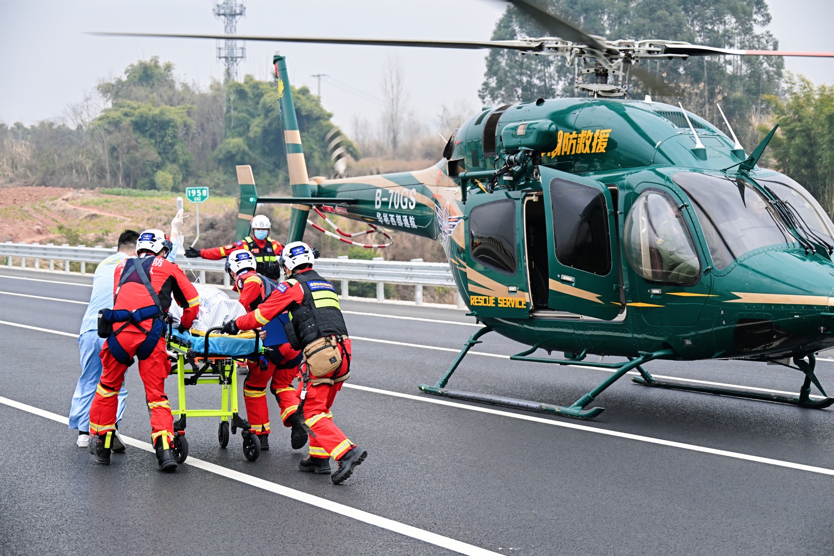 此次演练的一大亮点,是由高速公安牵头、经华西医院专业培训的“CERT”(联合应急响应)小队在现场对伤员进行快速检伤分类,并针对人员严重伤情,在川内多车道高速公路中首次启用直升机参与应急救援、转运伤员。据了解,此次参与救援的直升机配备呼吸机、除颤仪等设备,相当于“空中移动ICU”,通过“交通事故伤员救治信息服务平台”与医院实时共享伤情信息,畅通“空中转运——地面衔接——院内急救”的生命通道。