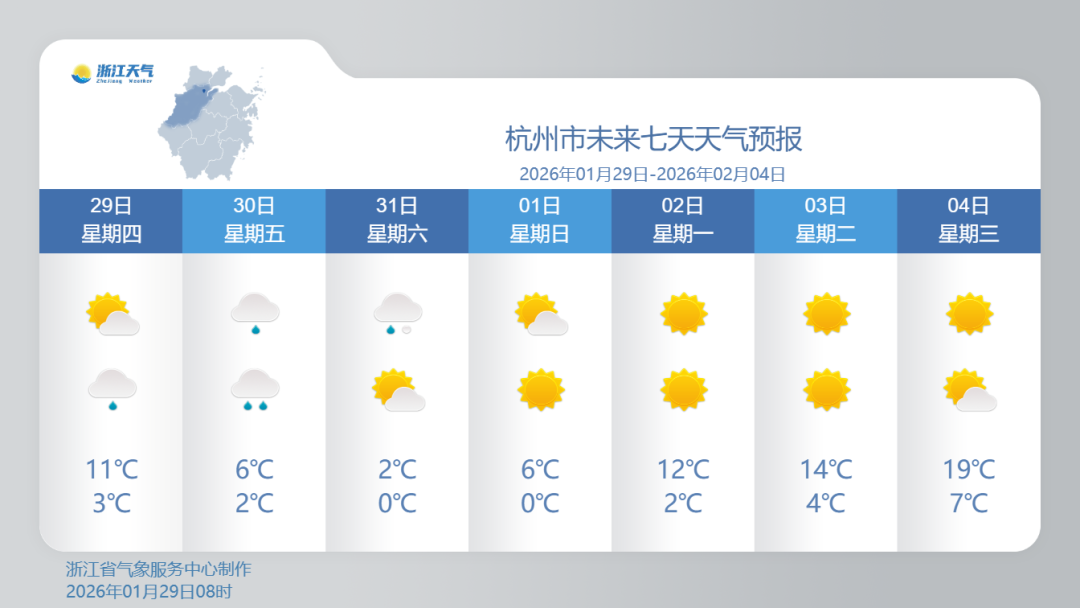 明天冷空气抵达我省,气温开始下降,白天降温最明显出现在31日(周六),浙北地区降至2~5℃、其他大部地区7~10℃;雨雪过后, 2月2日、3日早晨大部地区最低气温0℃左右局部有薄冰,山区-2~-4℃有冰冻。