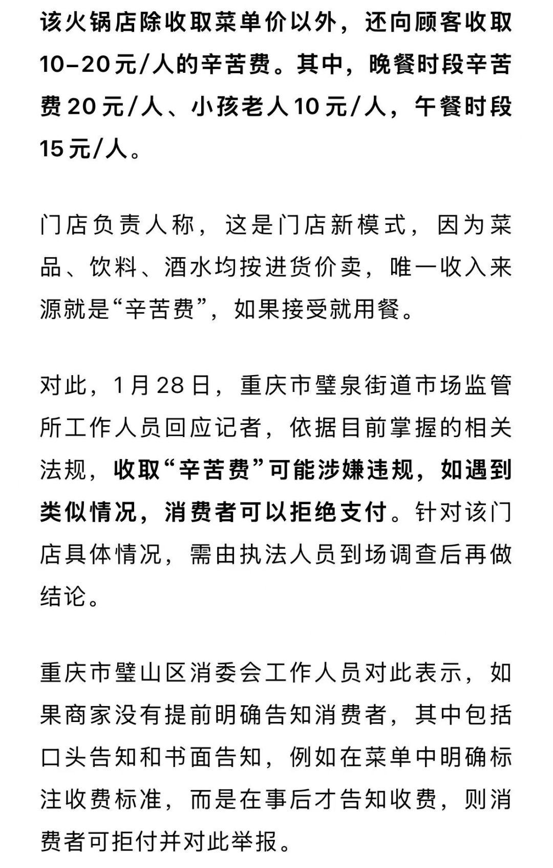 近日,网传“重庆一火锅店存在向消费者每人收20元‘辛苦费’的行为”。我局高度重视,第一时间组织执法人员赶赴现场开展核查处置工作,现将相关情况通报如下: