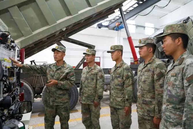 雷耀明(左一)向年轻战友讲解装备原理。马新周 摄