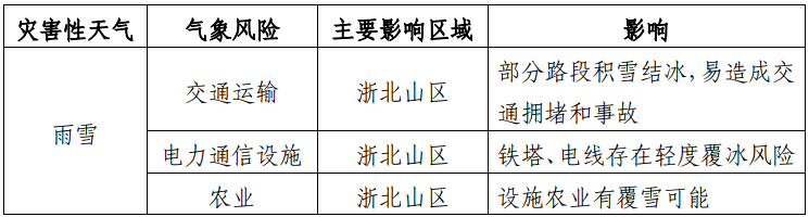 入冬以来,浙江降水偏少八成,本次雨雪将对延缓旱情、降低森林火险风险、改善空气质量有利。同时,需关注雨雪天气对浙北山区交通运输、电力通信设施、农业等的影响。