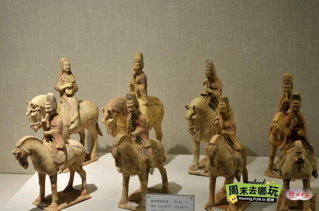 当一列列整齐肃穆的马队映入眼帘,“震撼”成为最直接的感受。青瓷莹润素雅,三彩艳丽奔放,二者对比陈列,风格鲜明,令人印象至深。一组青瓷乐队俑骑马而立,人物庄严,衣袂翩然,仿佛能透过玻璃听见穿越时空的乐曲回响。