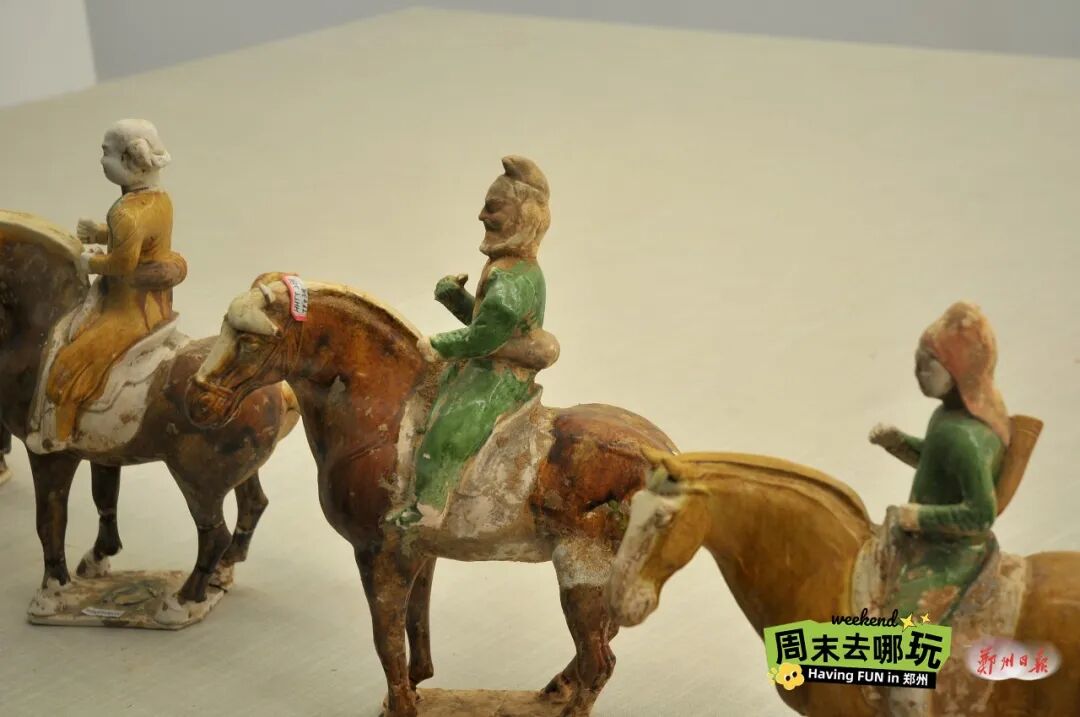 一组三彩骑马俑中,络腮胡男子眉间微蹙,满面淡愁,远望前方;胯下马匹静立,马首左转,似与主人同望一方。“挥手自兹去,萧萧班马鸣”,这或许正是千年前一场送别后的真实刻画。离别之情、无奈之思,借人物神态与马匹姿态流露无遗,感染着每一位观者。