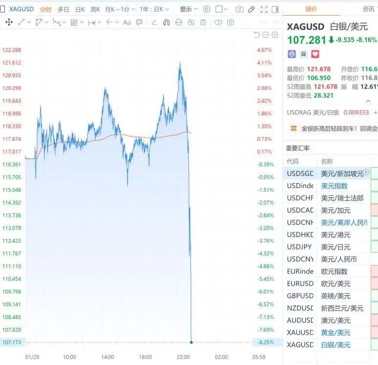 1月29日,国际金银价格冲高后出现大幅回落,现货白银日内跌幅扩大至8%,报107美元/盎司。现货黄金日内跌幅扩大至5%,报5137.34美元/盎司。今日盘中,现货黄金、白银此前分别上涨3%、4%。