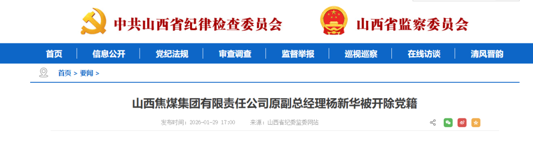 日前,经省委批准,省纪委监委对山西焦煤集团有限责任公司原副总经理杨新华严重违纪违法问题进行了立案审查调查。
