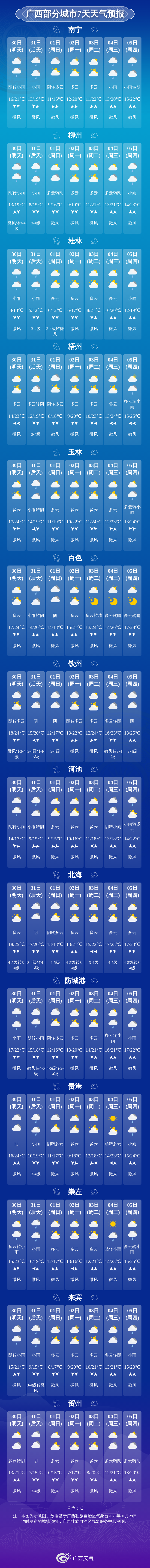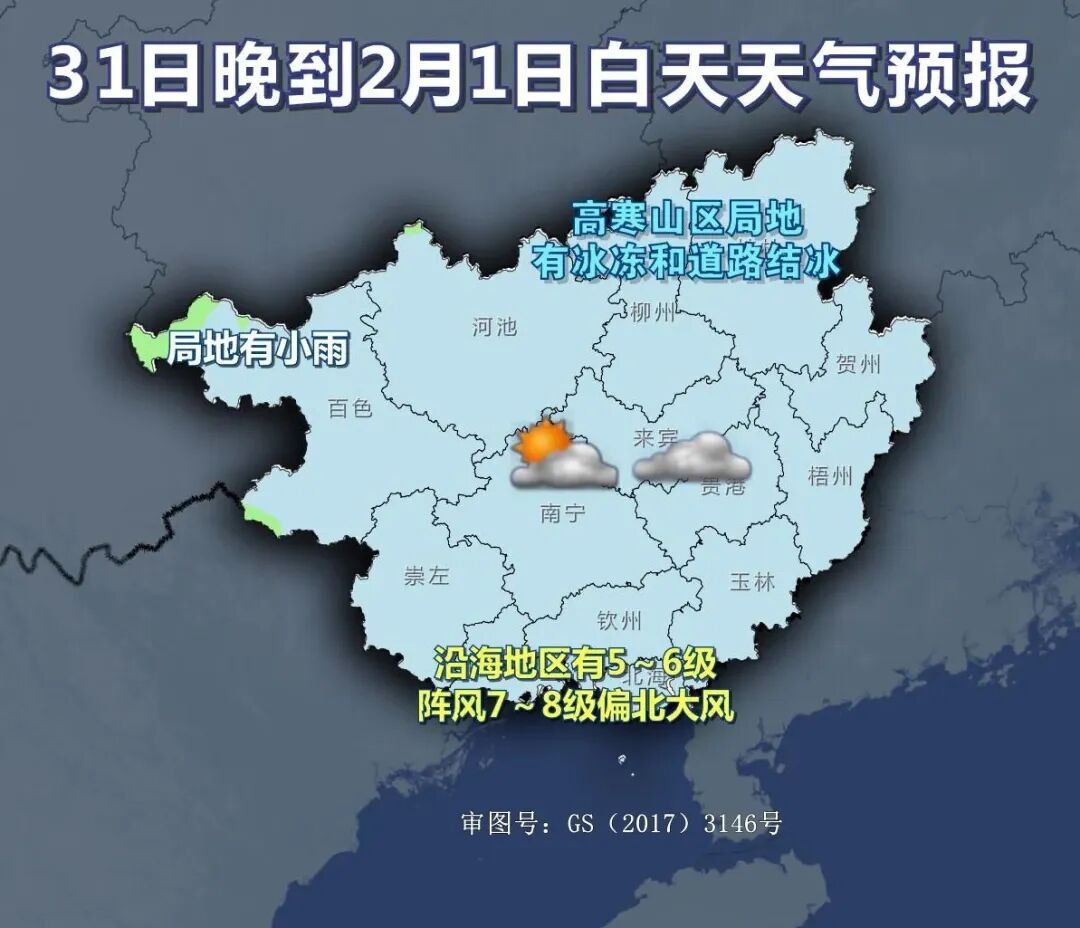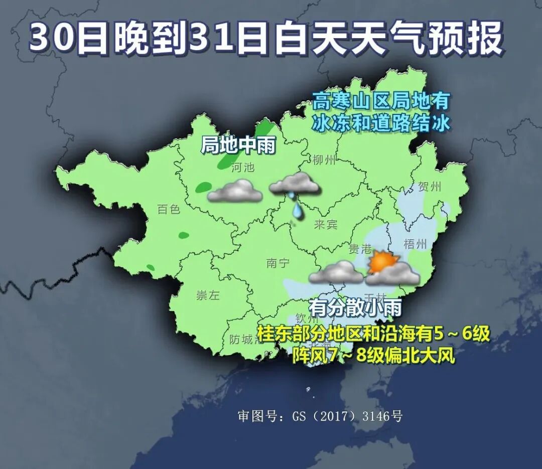 30日晚上到31日白天,桂北、桂西阴天有小雨、局地中雨,其他地区阴天到多云有分散小雨。高寒山区局地有冰冻和道路结冰。桂东部分地区和沿海有5~6级、阵风7~8级偏北大风。最低气温:高寒山区-3℃~3℃,桂东北3℃~7℃,沿海14℃~18℃,其他地区8℃~14℃。