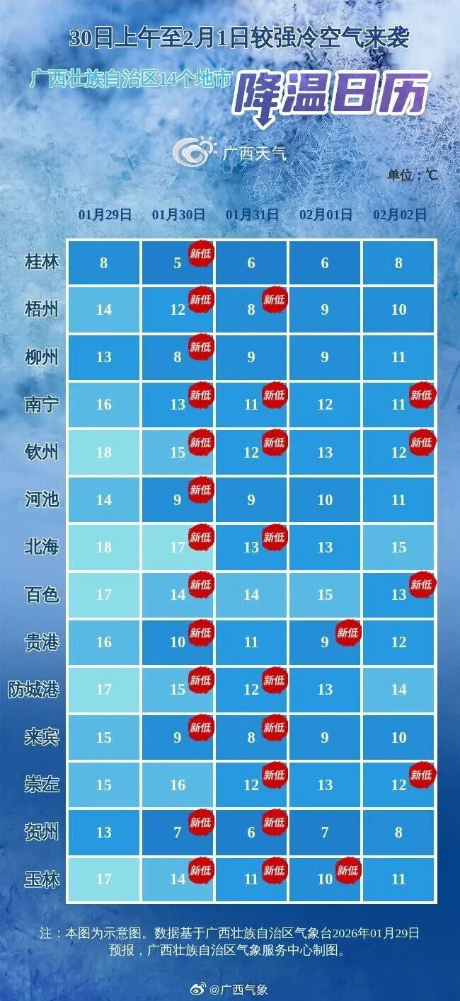 30日上午至2月1日,受较强冷空气影响,桂东日平均气温下降4℃~6℃、局地8℃以上,桂西下降2℃~4℃、局地6℃以上。