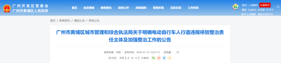 1月27日,广州市黄埔区城市管理和综合执法局发布《关于明确电动自行车人行道违规停放整治责任主体及加强整治工作的公告》,在临时停放区外的人行道违规停放电动自行车且驾驶人不在现场的,将依法予以警告或处以50元罚款。