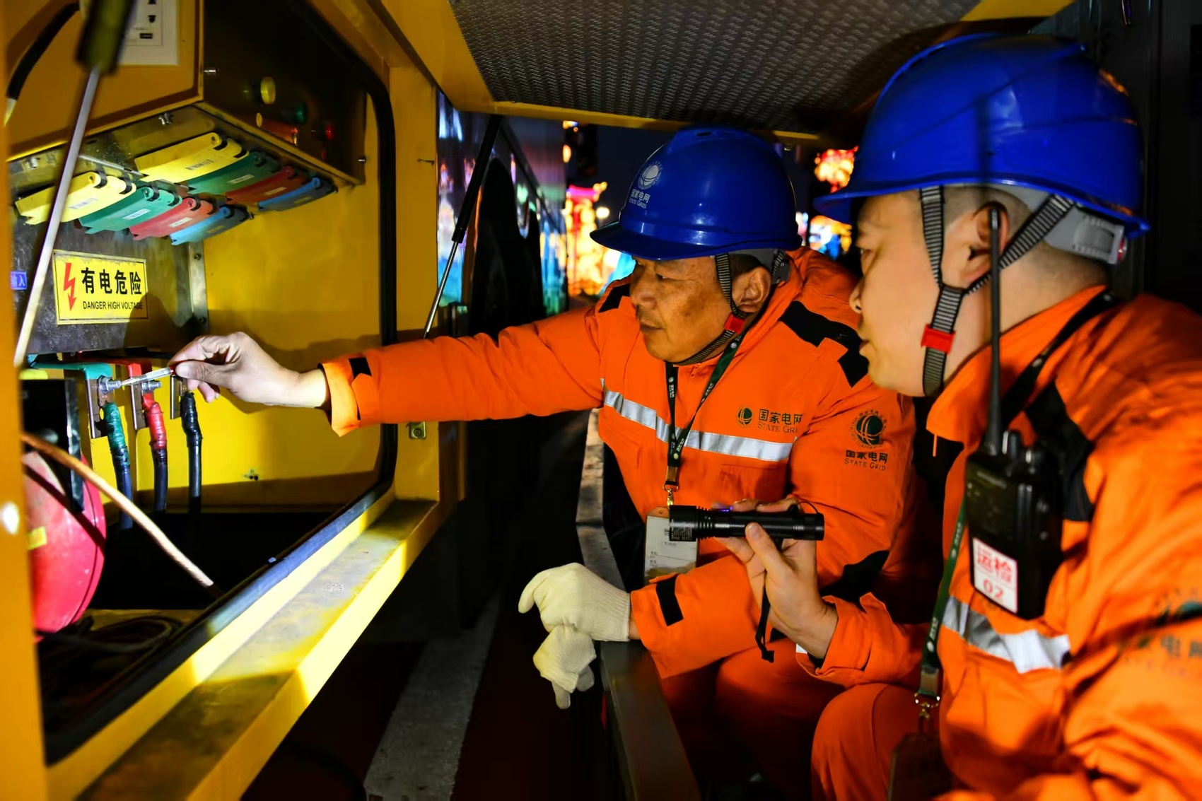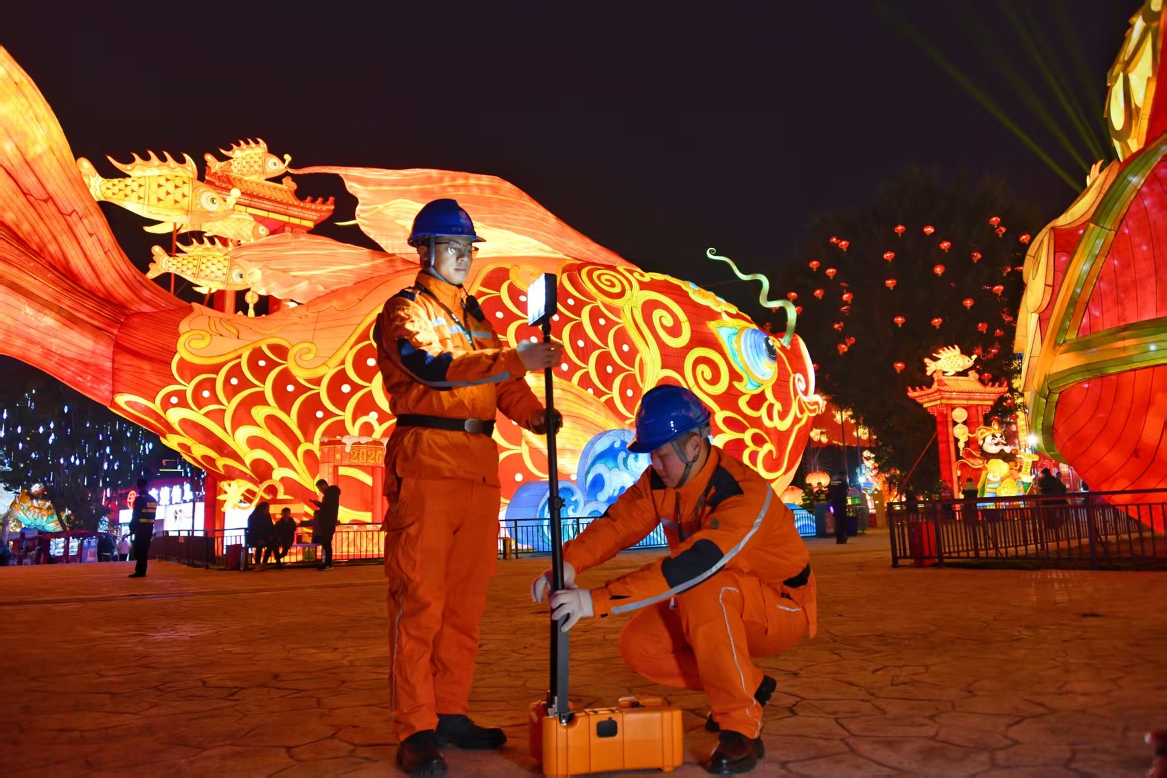 开幕当日,国网自贡供电公司以“内外联动+后台监控”方式落实全方位保电举措。园内各供电点位、园外变电站及线路关键节点均部署专人定点值守。应急发电车提前接入主舞台供电系统,提供专属备用电力。30余名保电员工驻园进行灯组测温巡检、电力设备巡查等工作。后台负荷监测组实时播报园区电量数据,全程动态监控灯会用电负荷及供电线路运行状态。