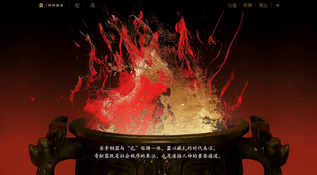 围绕这一核心主题,《青铜文明》融媒体数字特展精心构建「戎」、「祀」、「食」、「乐」、「融」五大交互网页。