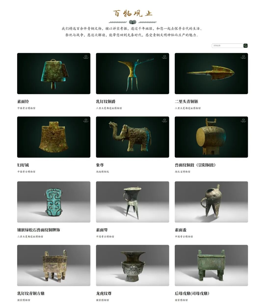 《百物观止》数字典藏同步亮相!这里汇聚了收藏于海内外五十余家博物馆的120件青铜重器。网页支持检索,可放大观看文物细节,实现高精度三维交互,并且提供文字及语音导览。