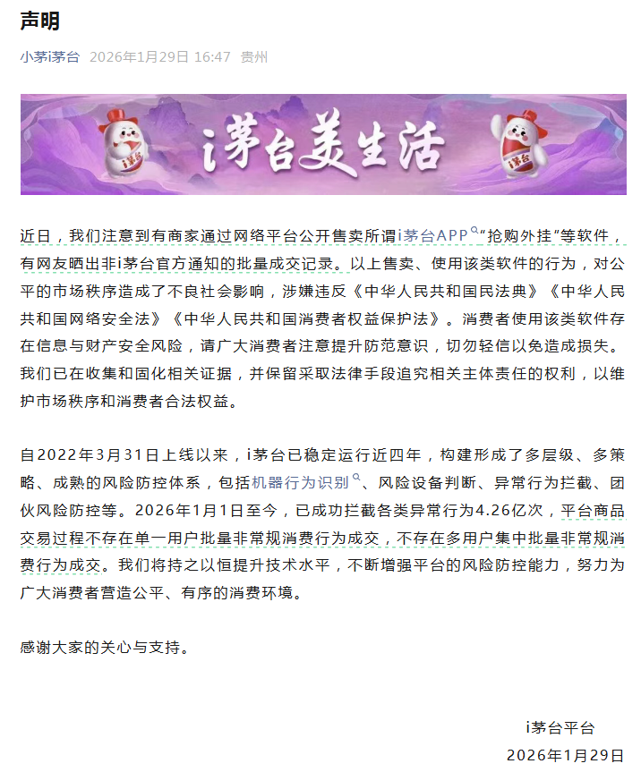 声明称,2026年1月1日至今,i茅台已成功拦截各类异常行为4.26亿次。平台商品交易过程不存在单一用户批量非常规消费行为成交,不存在多用户集中批量非常规消费行为成交。