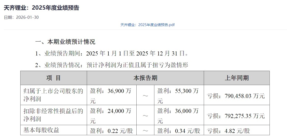 根据天齐锂业最新发布的2025年度业绩预告,公司预计全年归属于上市公司股东的净利润3.69亿元至5.53亿元,同比实现扭亏为盈;预计全年扣除非经常性损益后的净利润2.4亿元至3.6亿元,同比实现扭亏为盈。