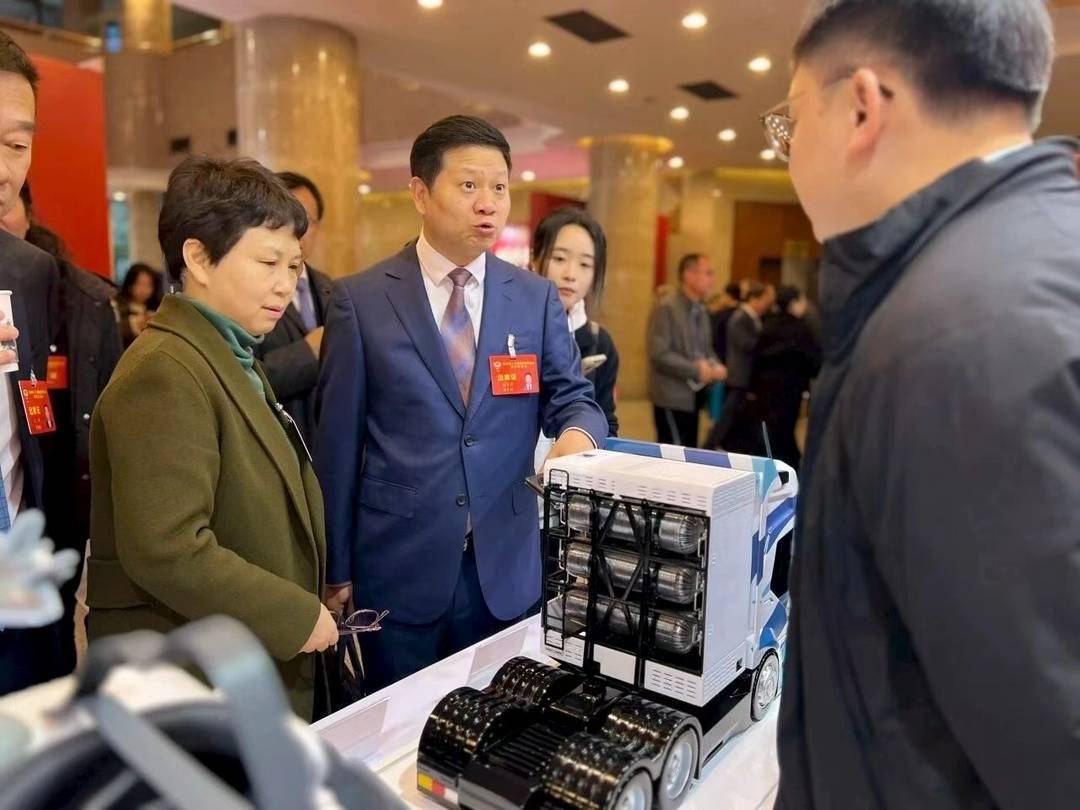 金牛宾馆大礼堂内,暖意与新意交织。参会的人大代表、政协委员们纷纷驻足展台,被一件件亮眼的“新津造”工业精品吸引。在中材科技展台前,车载供气系统引发围观。“车载供气系统是为天然气或氢气汽车提供燃料存储、供给与控制的关键系统装置。主要由高压气瓶、框架组、减压阀、管路及电控单元等组成。它安全地将气体减压后输送至发动机或燃料电池,实现高效清洁燃烧,具有环保、经济的特点,广泛应用于重卡、客车、公交车等车型。”现场工作人员向代表委员介绍道。