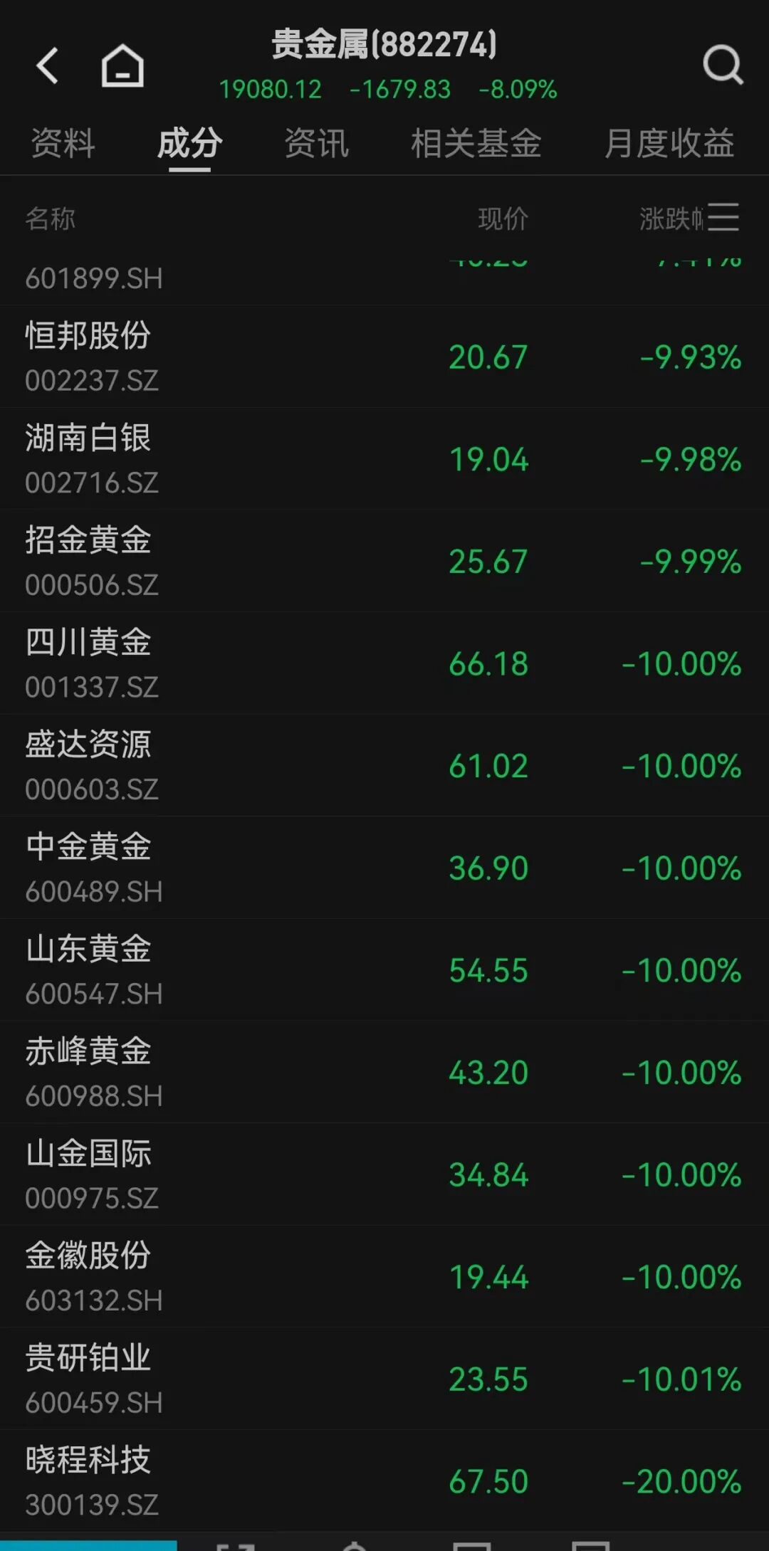 A股市场贵金属概念股大面积跌停,截至发稿,晓程科技20%跌停,招金黄金、中金黄金、山东黄金、湖南白银等纷纷跌停。
