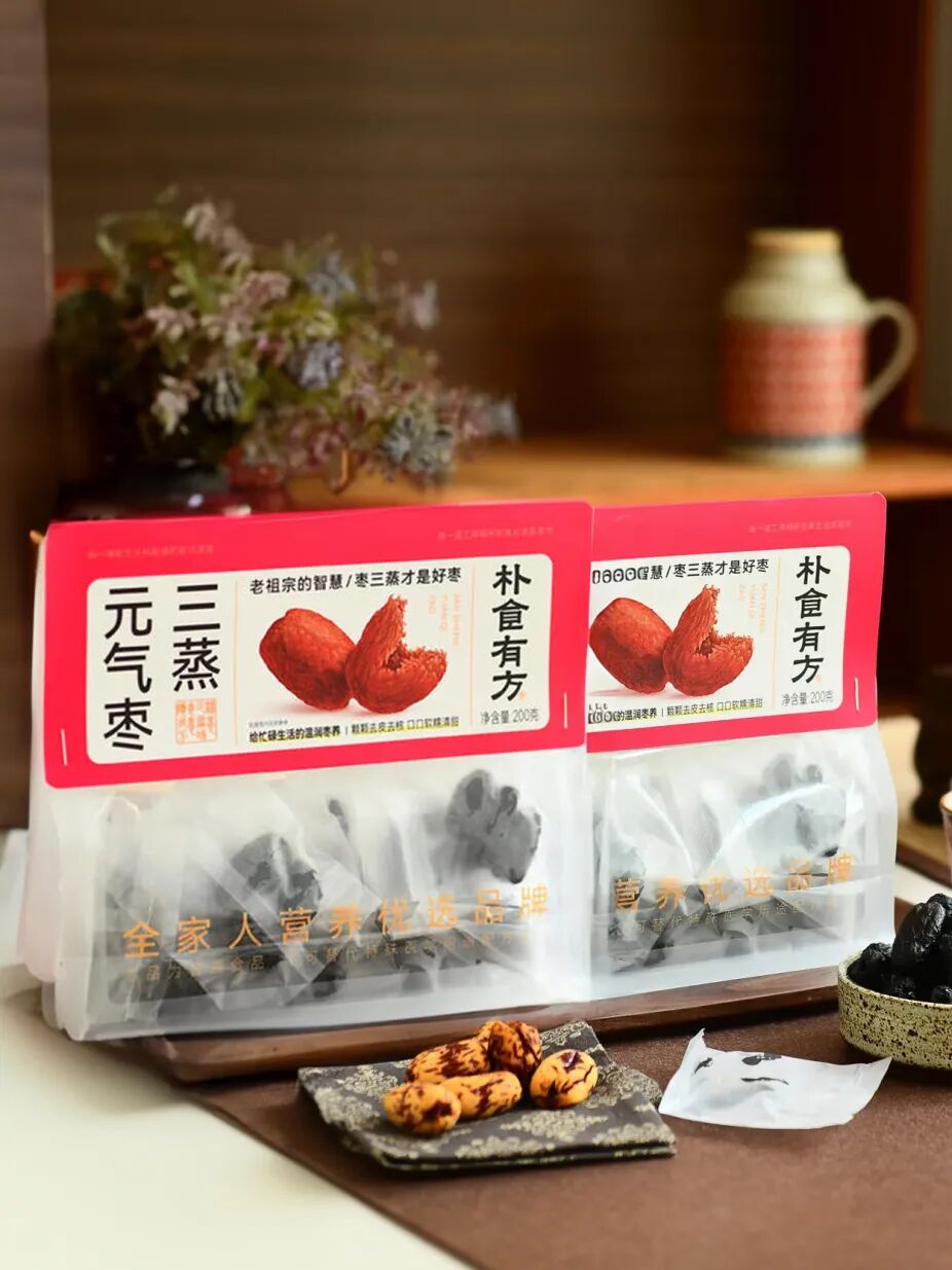 经过三蒸三晒后的红枣,寒性燥性被蒸发,捏在手里软糯Q弹,送入口中像咬开蜜羹,暖意顺着枣香在全身铺开。