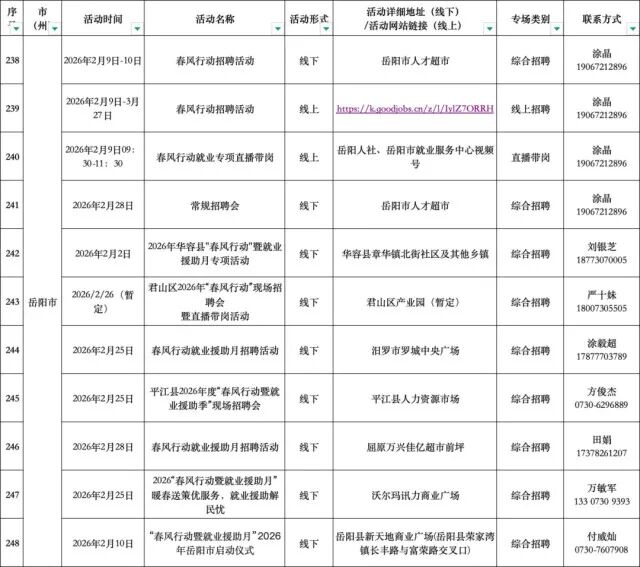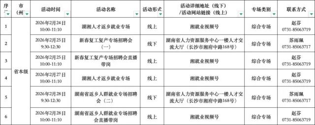 准备春节前后求职的小伙伴注意啦!2月湖南省招聘会安排来了各级公共就业服务机构均有安排集中为劳动者和用人单位提供求职招聘精准对接服务求职者可提前对照选场用人单位可提前对接参与快转给身边需要的人吧!附:全省公共招聘活动预告信息表(具体活动安排按实际举办地为准)省本级