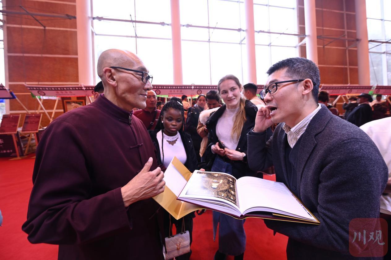 国家一级工艺美术大师,国家级非物质文化遗产唐卡传承人土灯格拉给国际友人讲述在16国30展中脱颖而出,首个亮相卢浮宫的道孚非遗作品