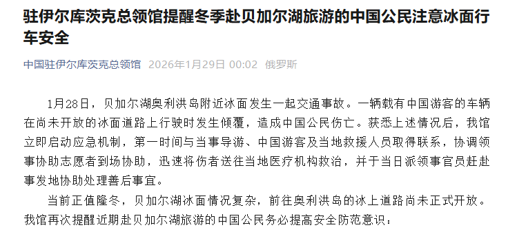 驻伊尔库茨克总领馆提醒冬季赴贝加尔湖旅游的中国公民注意冰面行车安全 1月28日,贝加尔湖奥利洪岛附近冰面发生一起交通事故。一辆载有中国游客的车辆在尚未开放的冰面道路上行驶时发生倾覆,造成中国公民伤亡。当前正值隆冬,贝加尔湖冰面情况复杂,前往奥利洪岛的冰上道路尚未正式开放。我馆再次提醒近期赴贝加尔湖旅游的中国公民务必提高安全防范意识。(详情请戳↓↓↓)