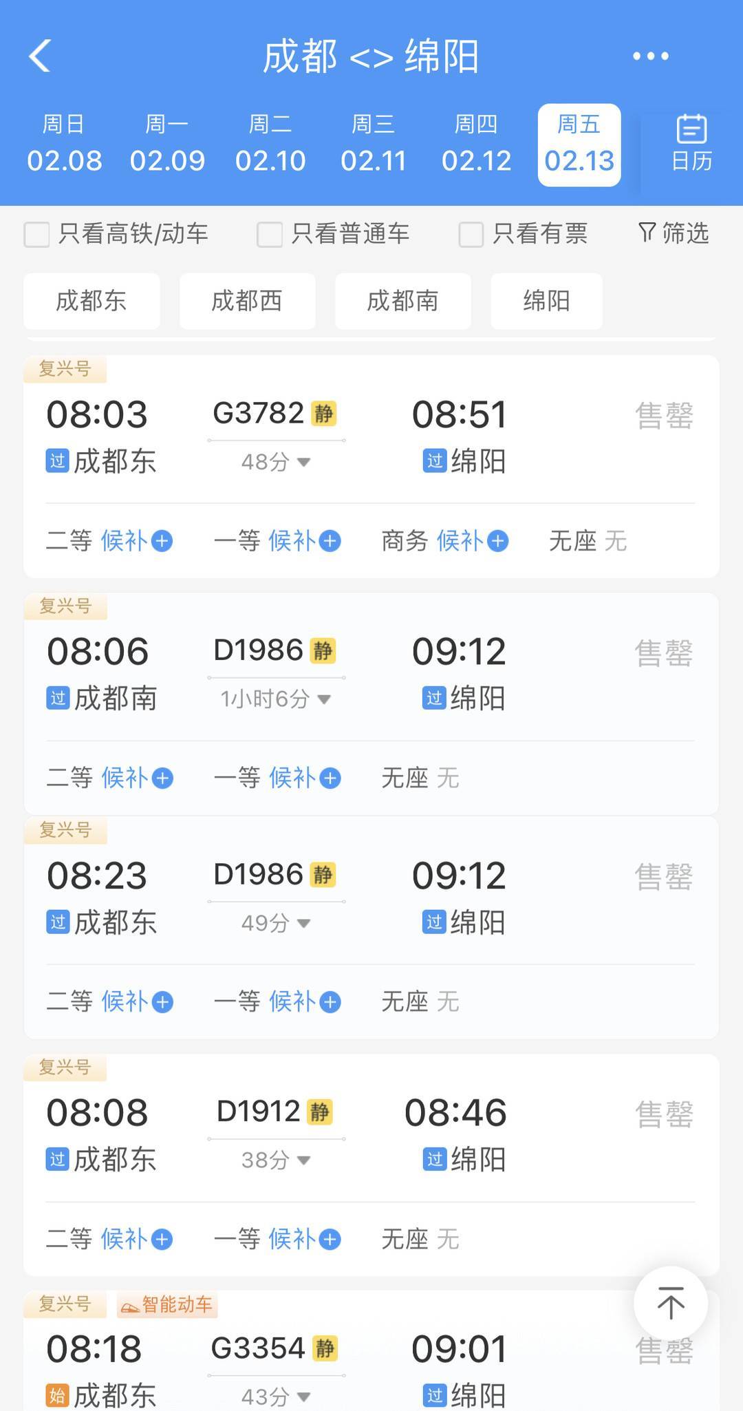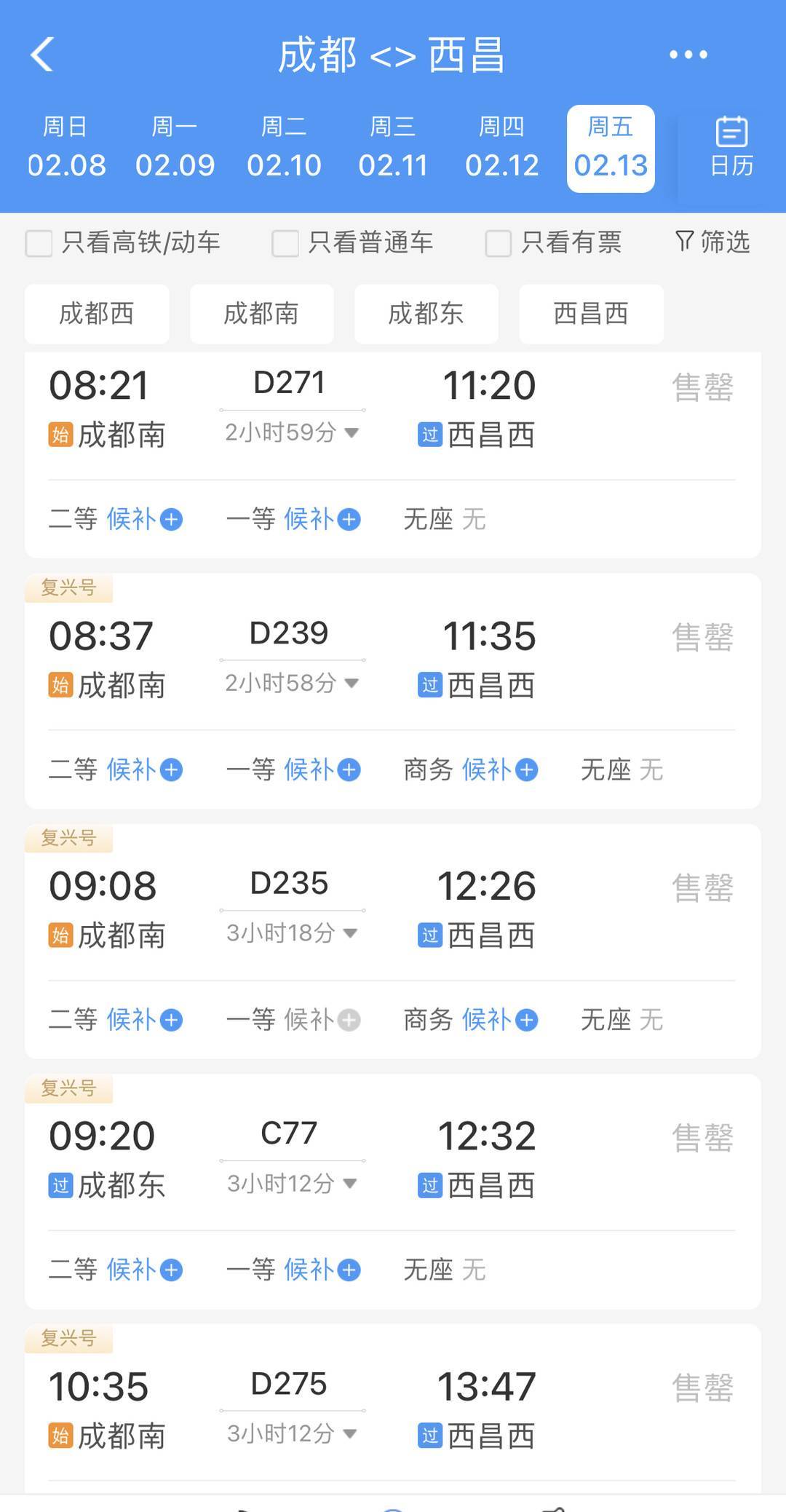 成都车站工作人员建议广大旅客朋友尽早规划行程,提前通过铁路12306 网站(含客户端)完成乘车人信息维护,并利用起售时间查询、起售提醒等功能,避免因信息不全或操作不及时影响购票;充分用好铁路12306候补购票功能,最大限度使用60个“日期+车次”的购票组合,选择的组合越多,候补成功率更高;在直达车票售罄的情况下,可根据铁路12306推荐的最优方案,采用同车接续、中转换乘等方式购票出行。