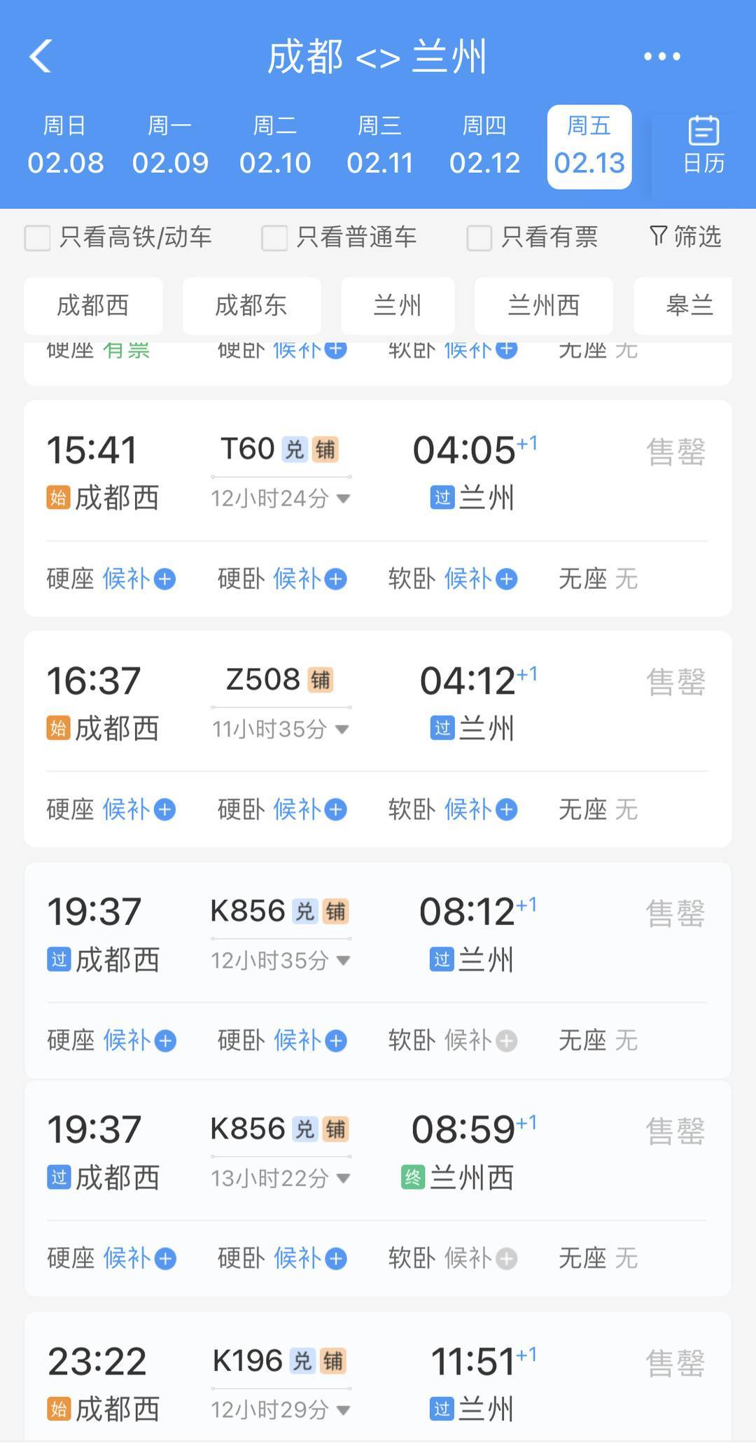 1月30日,2月13日(腊月二十六)的火车票开抢。国铁成都局成都车站相关工作人员介绍,截至当天12点,成都至绵阳、遂宁、南充、达州、广元、巴中、西昌、攀枝花等省内城市短途票已基本售罄;省外方面,成都至石家庄、太原、兰州、西安、洛阳的车票即将售罄,目前上午车次的车票已售完,仅剩下午的车次还有余票。
