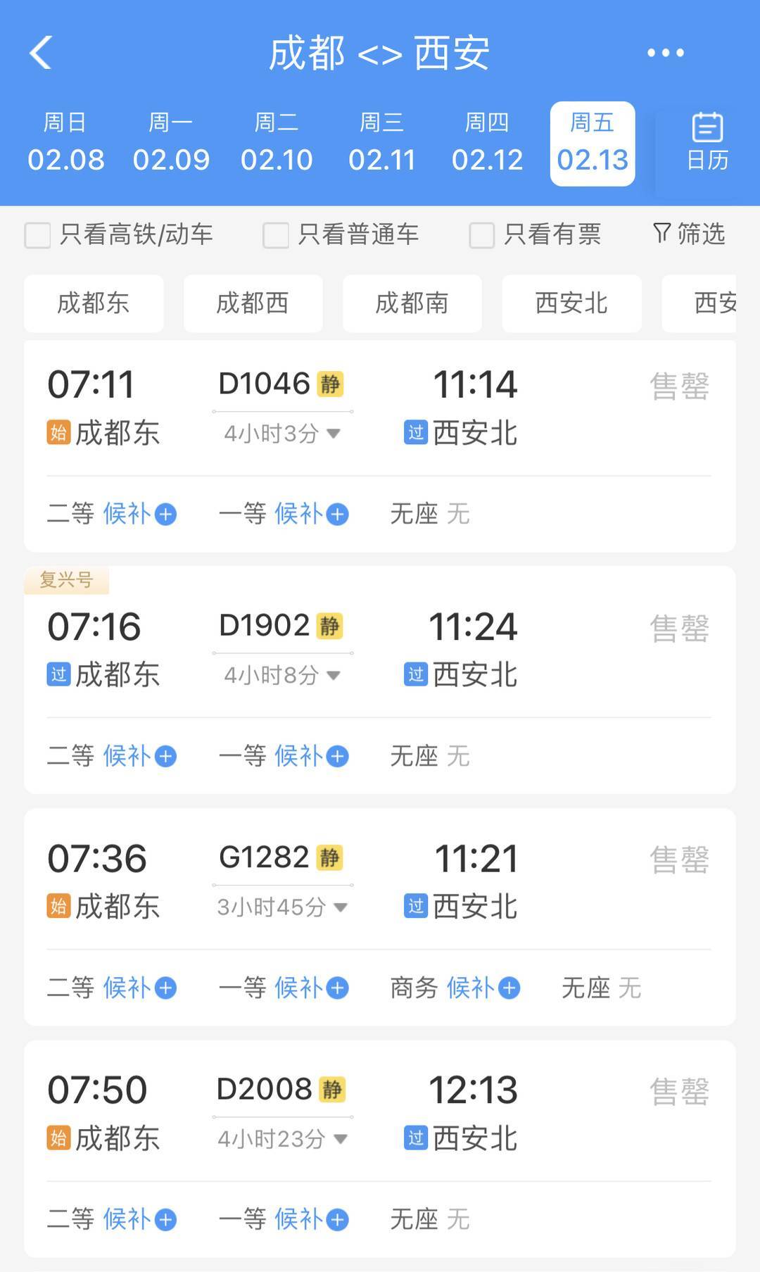 记者查询铁路12306了解到,成都至北上广等地的长途列车车票还比较充足;成渝高铁公交化运营,每日开行列车超百对,这条线也还有余票。