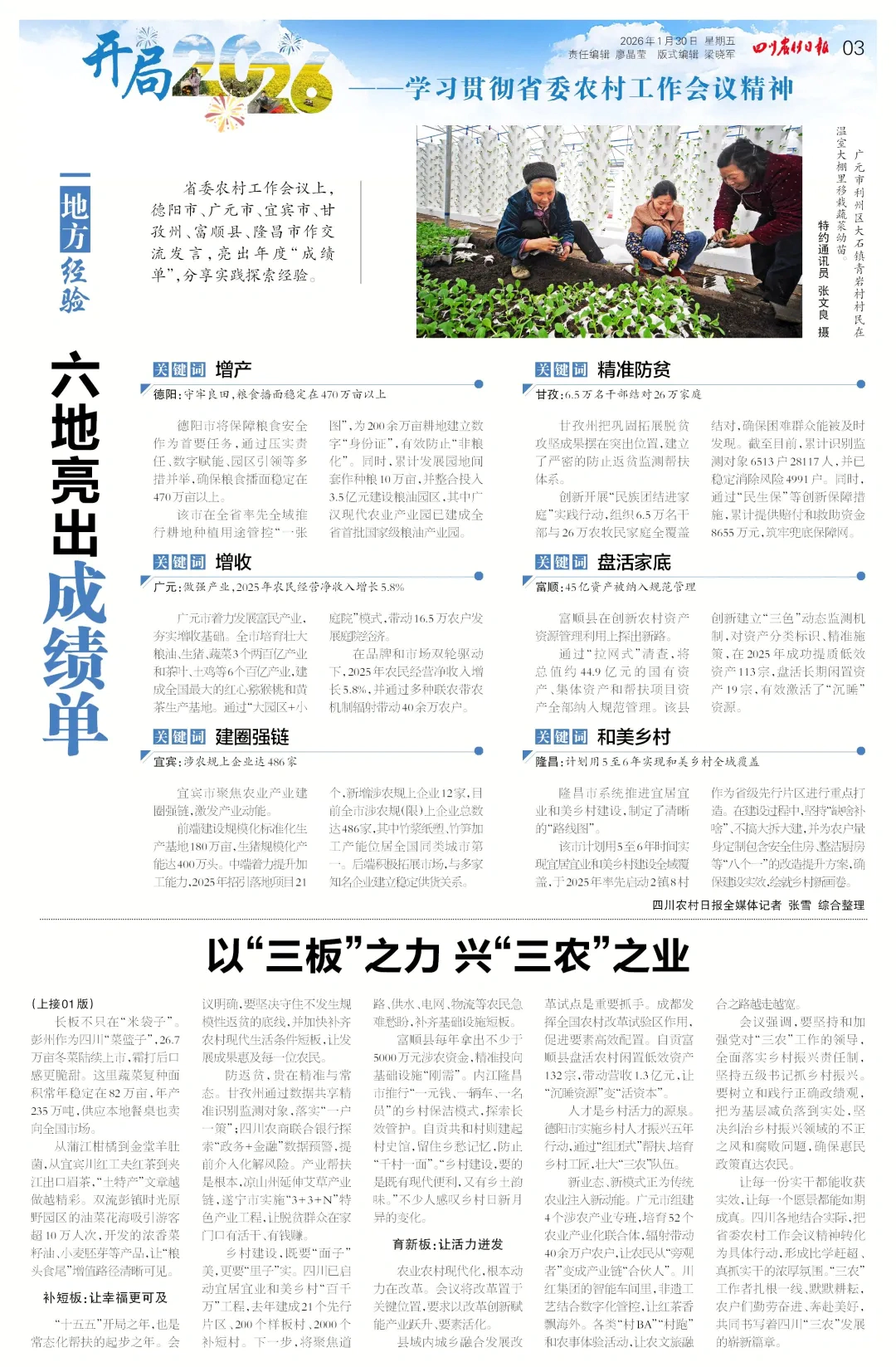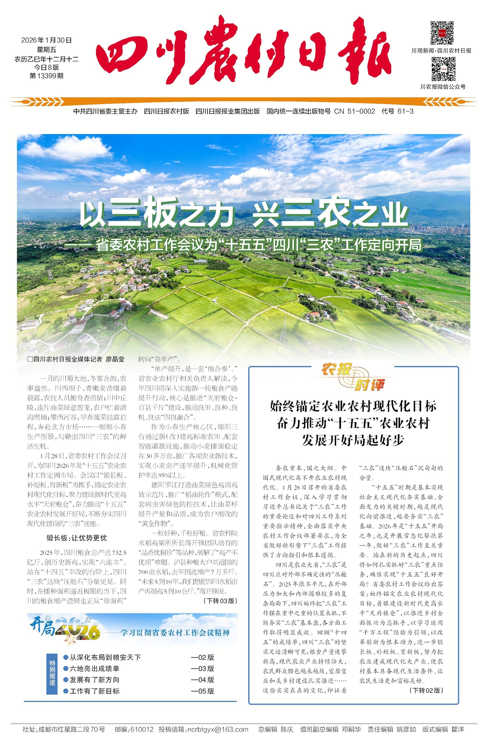 四川具体如何行动,将农业建成现代化大产业,让乡村更宜居、农民更富裕。看今天报纸头版头条《以三板之力 兴三农之业—— 省委农村工作会议为“十五五”四川“三农”工作定向开局》了解详实路径与生动案例。