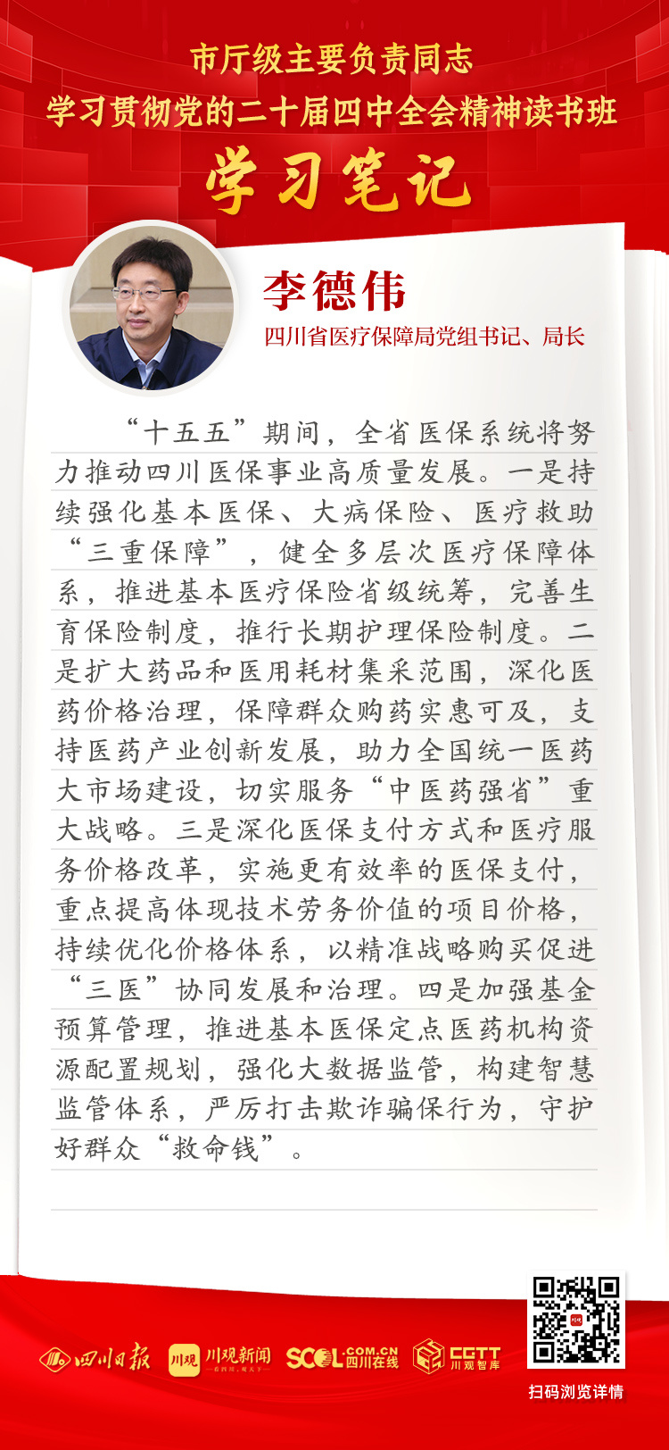 “十五五”期间,全省医保系统将努力推动四川医保事业高质量发展。一是持续强化基本医保、大病保险、医疗救助“三重保障”,健全多层次医疗保障体系,推进基本医疗保险省级统筹,完善生育保险制度,推行长期护理保险制度。二是扩大药品和医用耗材集采范围,深化医药价格治理,保障群众购药实惠可及,支持医药产业创新发展,助力全国统一医药大市场建设,切实服务“中医药强省”重大战略。三是深化医保支付方式和医疗服务价格改革,实施更有效率的医保支付,重点提高体现技术劳务价值的项目价格,持续优化价格体系,以精准战略购买促进“三医”协同发展和治理。四是加强基金预算管理,推进基本医保定点医药机构资源配置规划,强化大数据监管,构建智慧监管体系,严厉打击欺诈骗保行为,守护好群众“救命钱”。