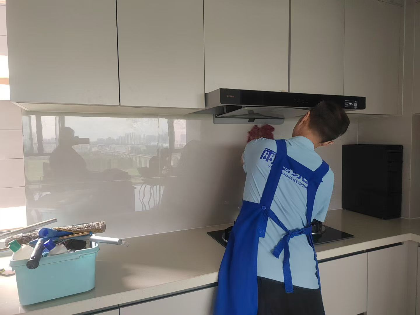 保洁人员清理厨房。(受访者供图)