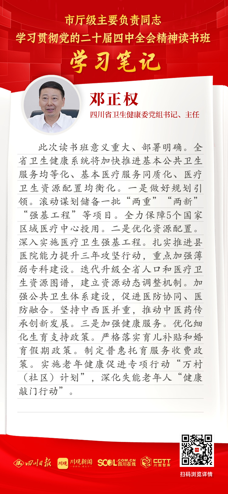 此次读书班意义重大、部署明确。全省卫生健康系统将加快推进基本公共卫生服务均等化、基本医疗服务同质化、医疗卫生资源配置均衡化。一是做好规划引领。滚动谋划储备一批“两重”“两新”“强基工程”等项目。全力保障5个国家区域医疗中心投用。二是优化资源配置。深入实施医疗卫生强基工程。扎实推进县医院能力提升三年攻坚行动,重点加强薄弱专科建设。迭代升级全省人口和医疗卫生资源图谱,建立资源动态调整机制。加强公共卫生体系建设,促进医防协同、医防融合。坚持中西医并重,推动中医药传承创新发展。三是加强健康服务。优化细化生育支持政策。严格落实育儿补贴和婚育假期政策。制定普惠托育服务收费政策。实施老年健康促进专项行动“万村(社区)计划”,深化失能老年人“健康敲门行动”。