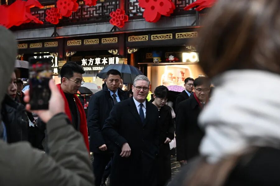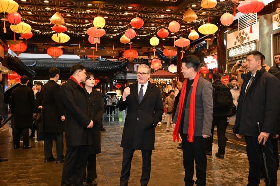 1月30日下午,天空下着细雨,英国首相斯塔默一行来到豫园,逛九曲桥,进湖心亭,与市民交流,感受中国传统文化。