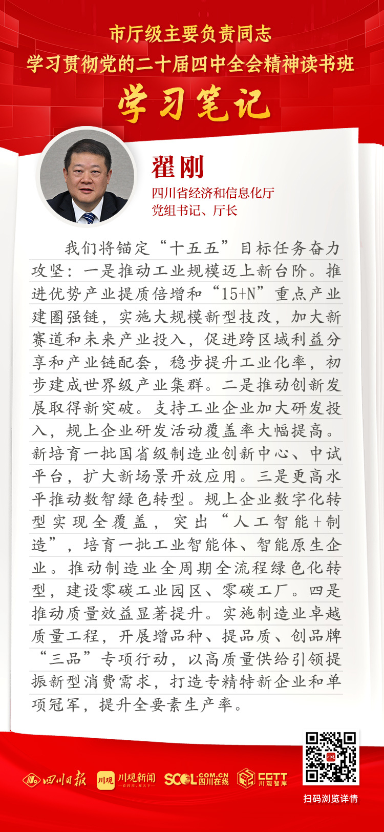 我们将锚定“十五五”目标任务奋力攻坚:一是推动工业规模迈上新台阶。推进优势产业提质倍增和“15+N”重点产业建圈强链,实施大规模新型技改,加大新赛道和未来产业投入,促进跨区域利益分享和产业链配套,稳步提升工业化率,初步建成世界级产业集群。二是推动创新发展取得新突破。支持工业企业加大研发投入,规上企业研发活动覆盖率大幅提高。新培育一批国省级制造业创新中心、中试平台,扩大新场景开放应用。三是更高水平推动数智绿色转型。规上企业数字化转型实现全覆盖,突出“人工智能+制造”,培育一批工业智能体、智能原生企业。推动制造业全周期全流程绿色化转型,建设零碳工业园区、零碳工厂。四是推动质量效益显著提升。实施制造业卓越质量工程,开展增品种、提品质、创品牌“三品”专项行动,以高质量供给引领提振新型消费需求,打造专精特新企业和单项冠军,提升全要素生产率。