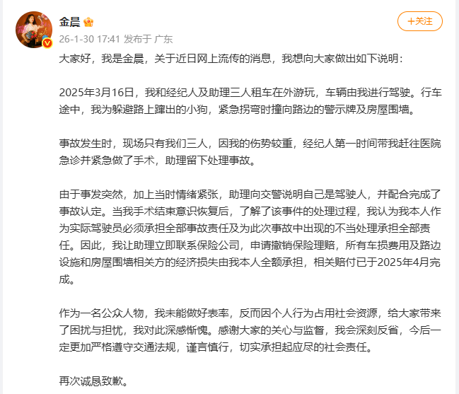 刚刚,金晨微博发文致歉。