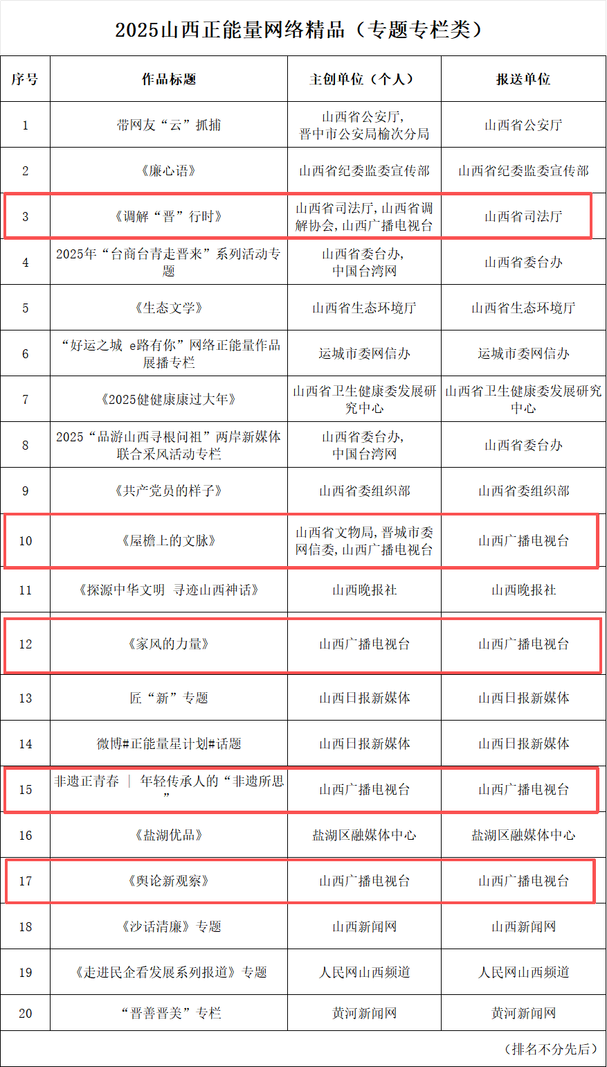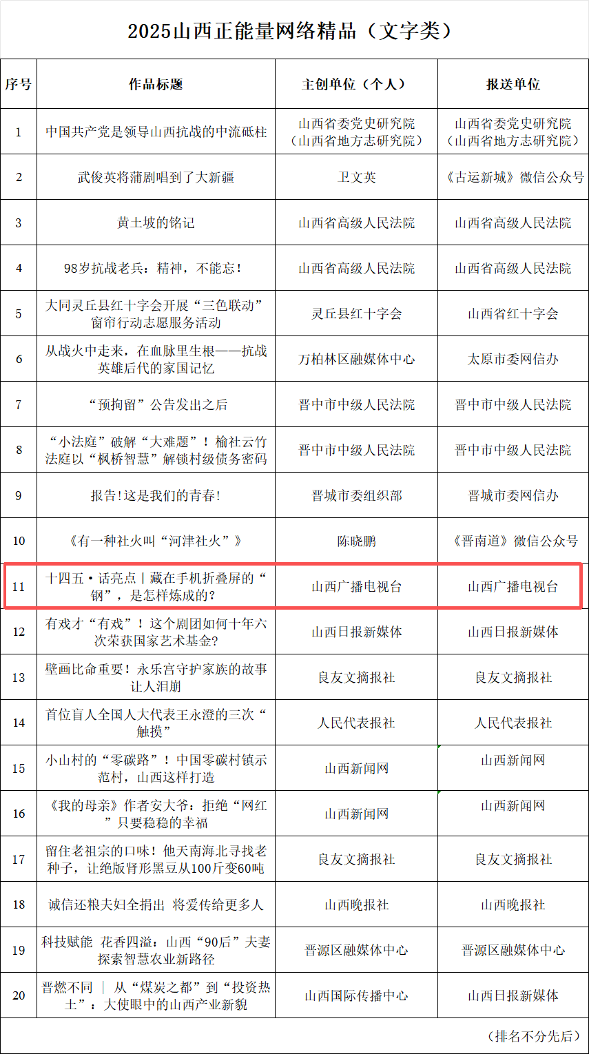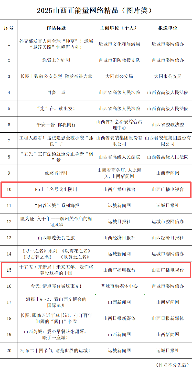2025山西正能量网络精品展播活动结果出炉,现拟对入选作品进行公示,公示时间为2026年1月29日至2026年2月4日。公示期间欢迎社会各界监督、评议,有关意见可发送至邮箱sxwlxcc@163.com,我们将及时受理、认真核查。公示期满后将适时对外发布最终结果,并在线上进行集中展播。