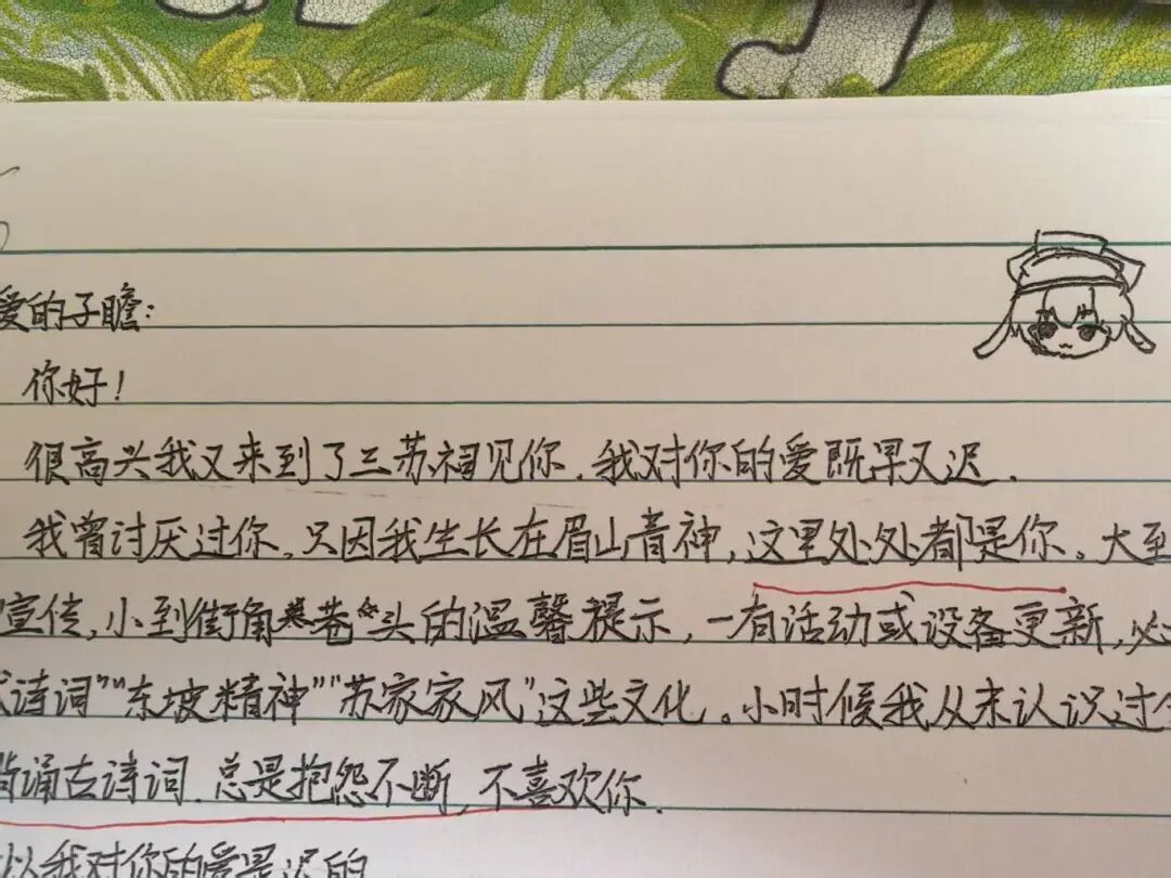来看这封:“亲爱的子瞻,我讨厌过你,只因我生长在眉山青神,这里到处都是你。背你的诗,我总是抱怨不断。”
