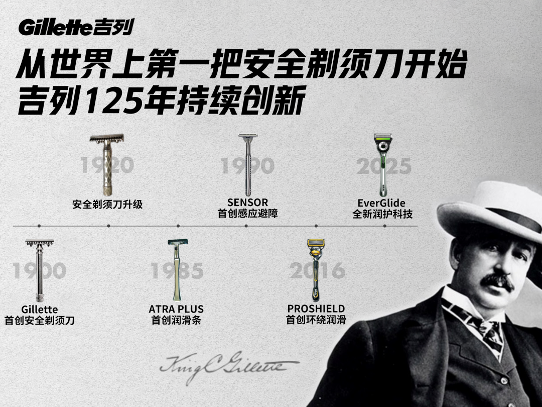 这把改变行业的安全剃须刀,奠定了吉列125年的品牌基因。125年来,安全、贴合、舒适是吉列刻在产品里的灵魂。从世界上第一把安全剃须刀到多层渐进式刀片,从纯手动到手电合1的微震科技,超过12轮重大剃须技术和产品的迭代,超过500项精密专利的积累,让剃须从一项“生活任务”进化为一种关乎“体面”与“自我”的享受仪式。