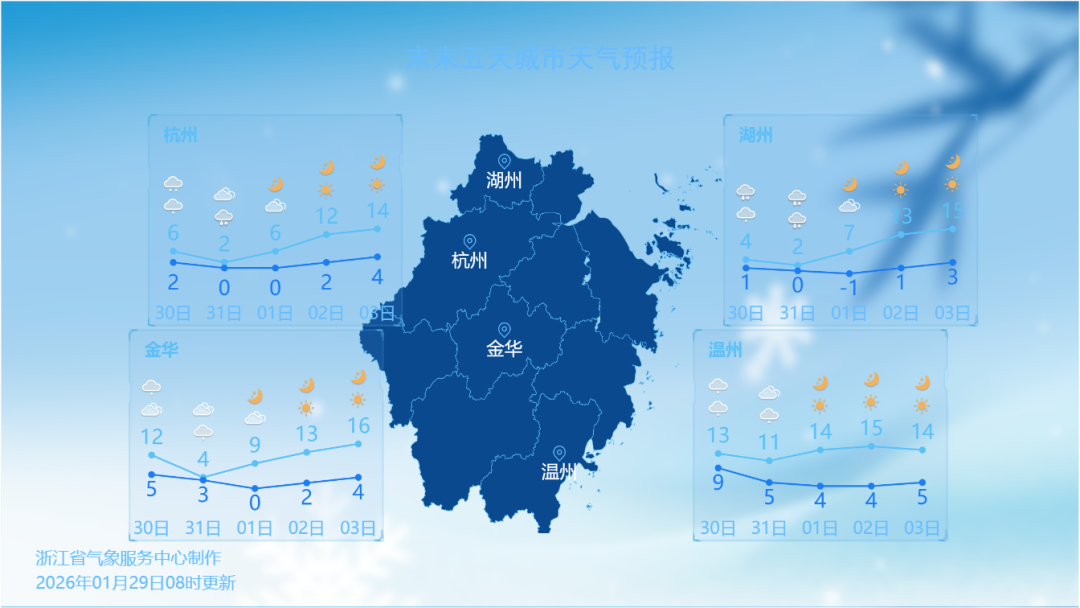 今天夜里到后天:浙西北山区部分有雨夹雪或雪,局部大到暴雪;浙中南地区阴有小雨,局部中雨;其它地区阴有中雨,后天下午起部分有雨夹雪。