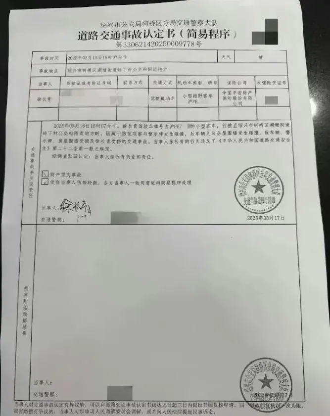 记者从网传的《绍兴市公安局柯桥区分局交通警察大队道路交通事故认定书(简易程序)》中看到,当事人徐长青在2025年3月16日15时07分许,驾驶小型客车与警示牌发生碰撞,后车辆又与房屋围墙发生碰撞,致车辆、警示牌、房屋围墙受损,徐长青受伤。