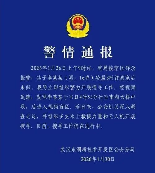 2026年1月26日上午9时许,我局接辖区群众报警,其子李某某(男,16岁)凌晨3时许离家后未归。我局立即组织警力开展搜寻工作。经视频追踪,发现李某某于当日4时53分行至南湖大桥中段,后进入视频盲区。连日来,公安机关深入调查走访,并组织多支水上救援力量和无人机开展搜寻。目前,搜寻工作仍在进行中。