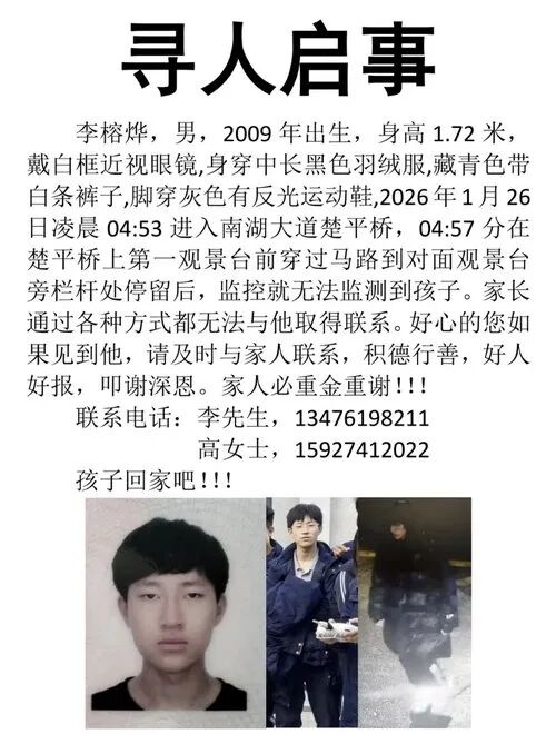 湖北武汉16岁男生李榕烨1月26日凌晨离家后失联,引发广泛关注。