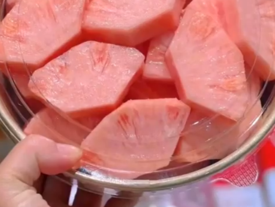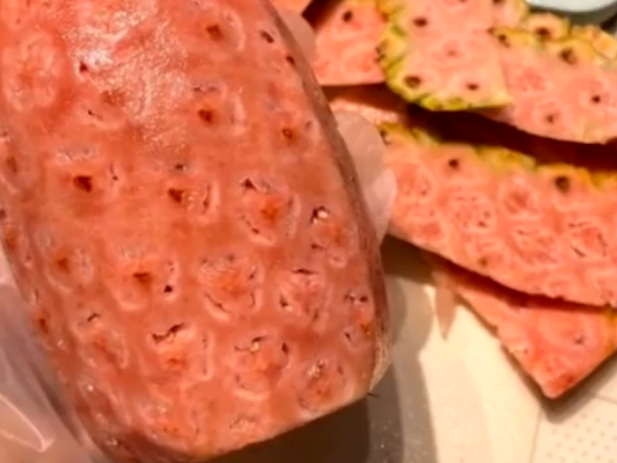 这种粉色菠萝的最大特点就是果肉的颜色是粉红色的。它并非自然生长的品种,而是通过调控番茄红素代谢路径培育的转基因品种。