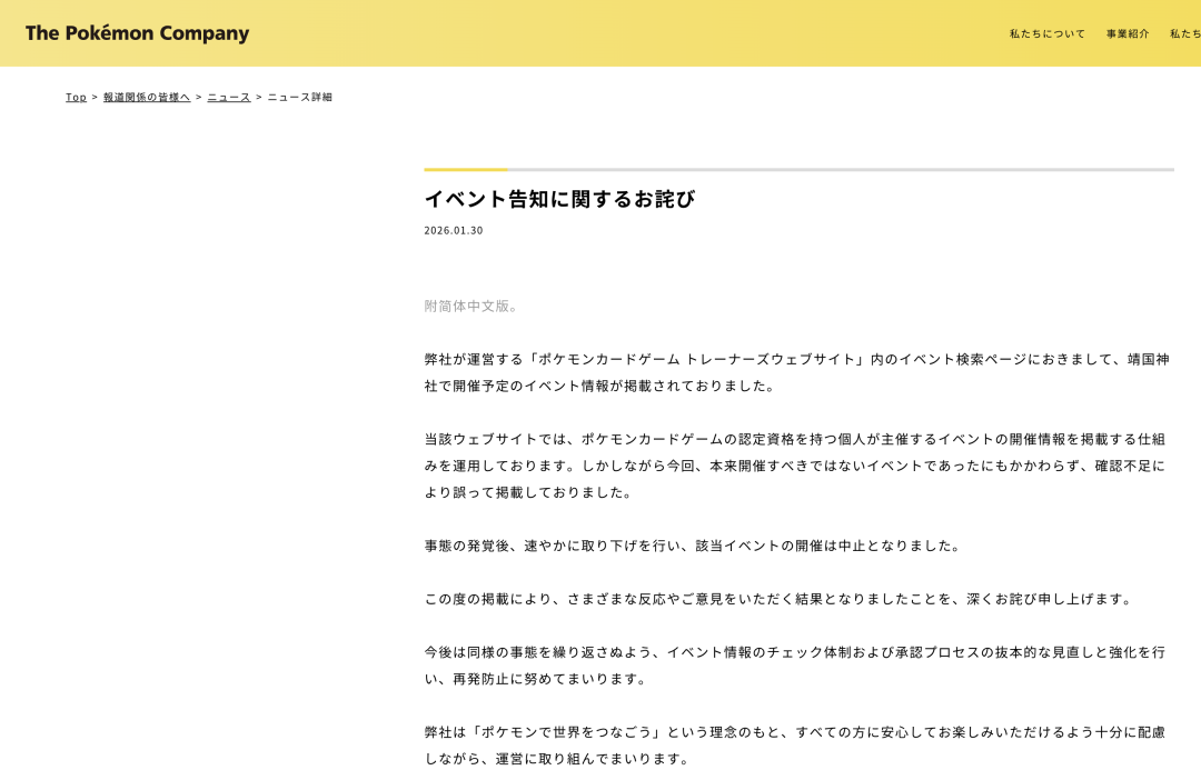 1月30日,宝可梦在官网发布中日双语“活动告知相关的致歉公告”——