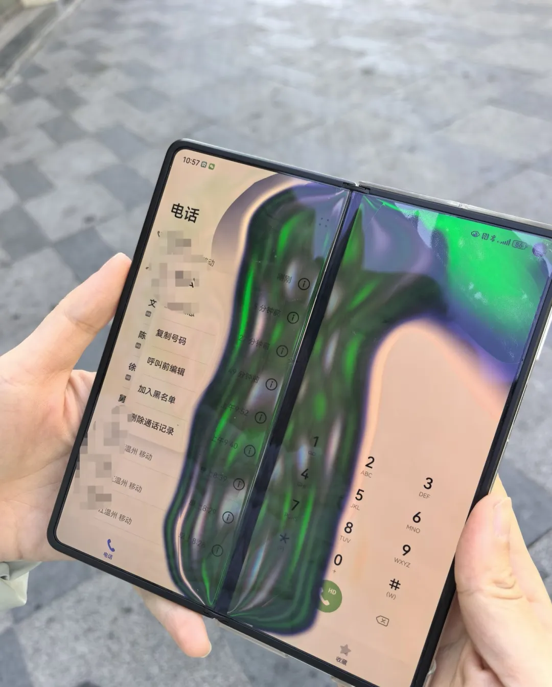 网友室外滑雪后折叠屏手机屏幕无法正常显示(视频截图)