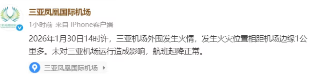 2026年1月30日14时许,三亚机场外围发生火情,发生火灾位置相距机场边缘1公里多。未对三亚机场运行造成影响,航班起降正常。