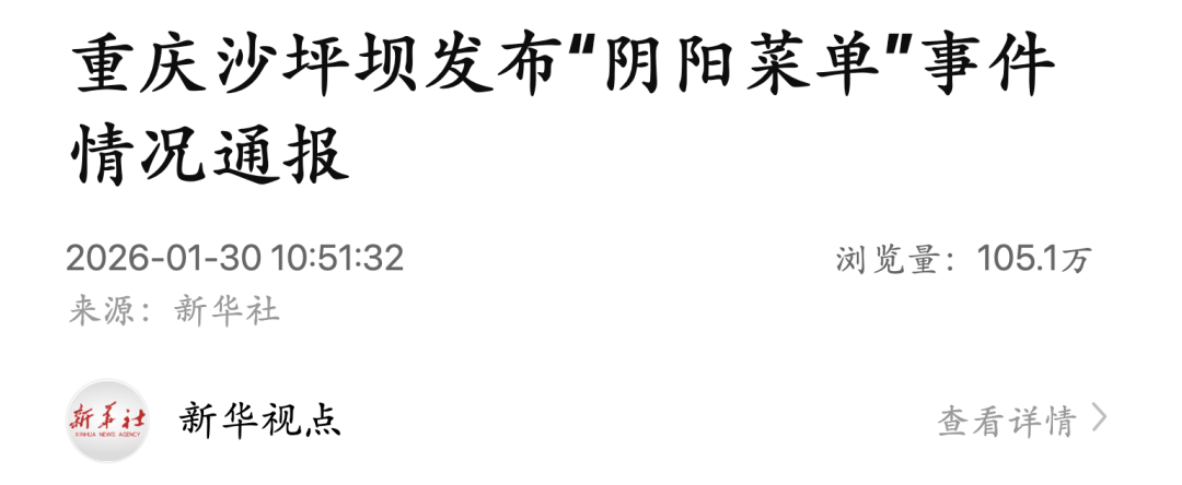 重庆市沙坪坝区市场监督管理局1月30日就网传“阴阳菜单”事件发布情况通报,称涉事饭店违规行为属实,责令其停业整顿,并向消费者退还费用。