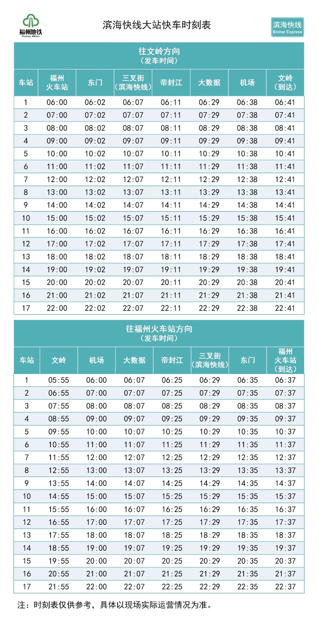 滨海快线原6:00直达快车提早至5:55,由福州火车站始发,中间增加停靠闽都、三叉街(滨海快线),其余沿途不停站,直达机场,终到文岭。取消原6:15始发直达快车。